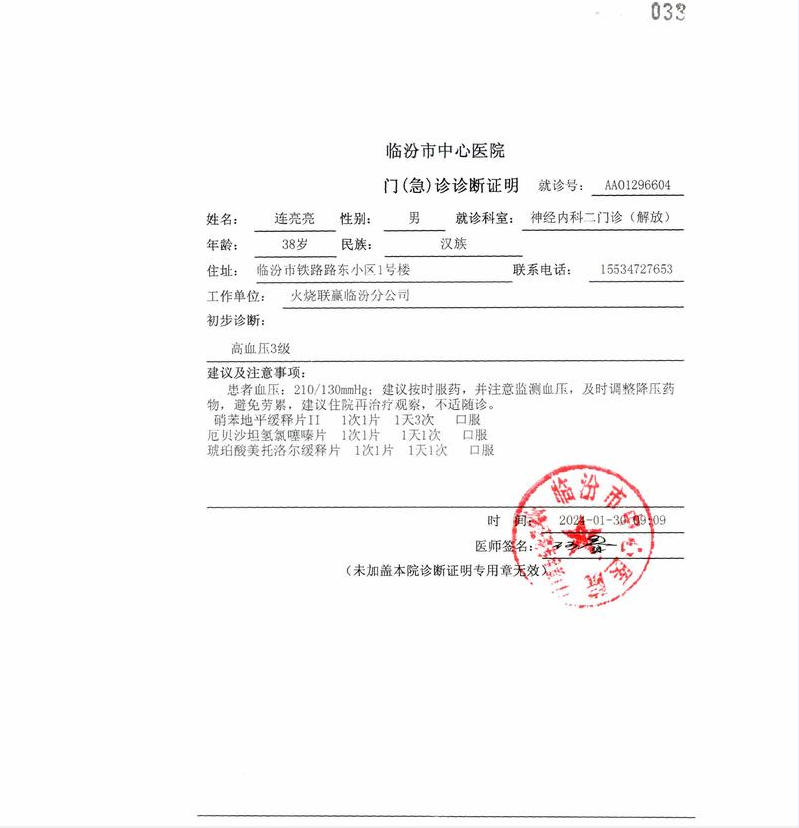 罪犯連亮亮,男,1985年2月17日出生于山西省鄉寧縣,漢族,初中文化,務工,住山西省鄉寧縣。罪犯連亮亮因犯幫助信息網絡犯罪活動罪,于2024年1月3日被我院判處拘役四個月,并處罰金人民幣二千元。案件生效后,罪犯連亮亮以其患有高血壓等疾病為由向本院申請暫予監外執行,本院已立案受理,現將基本情況予以公示,病歷診斷資料詳見附件。如有意見反饋,請于公示之日起三日內向我院提出。