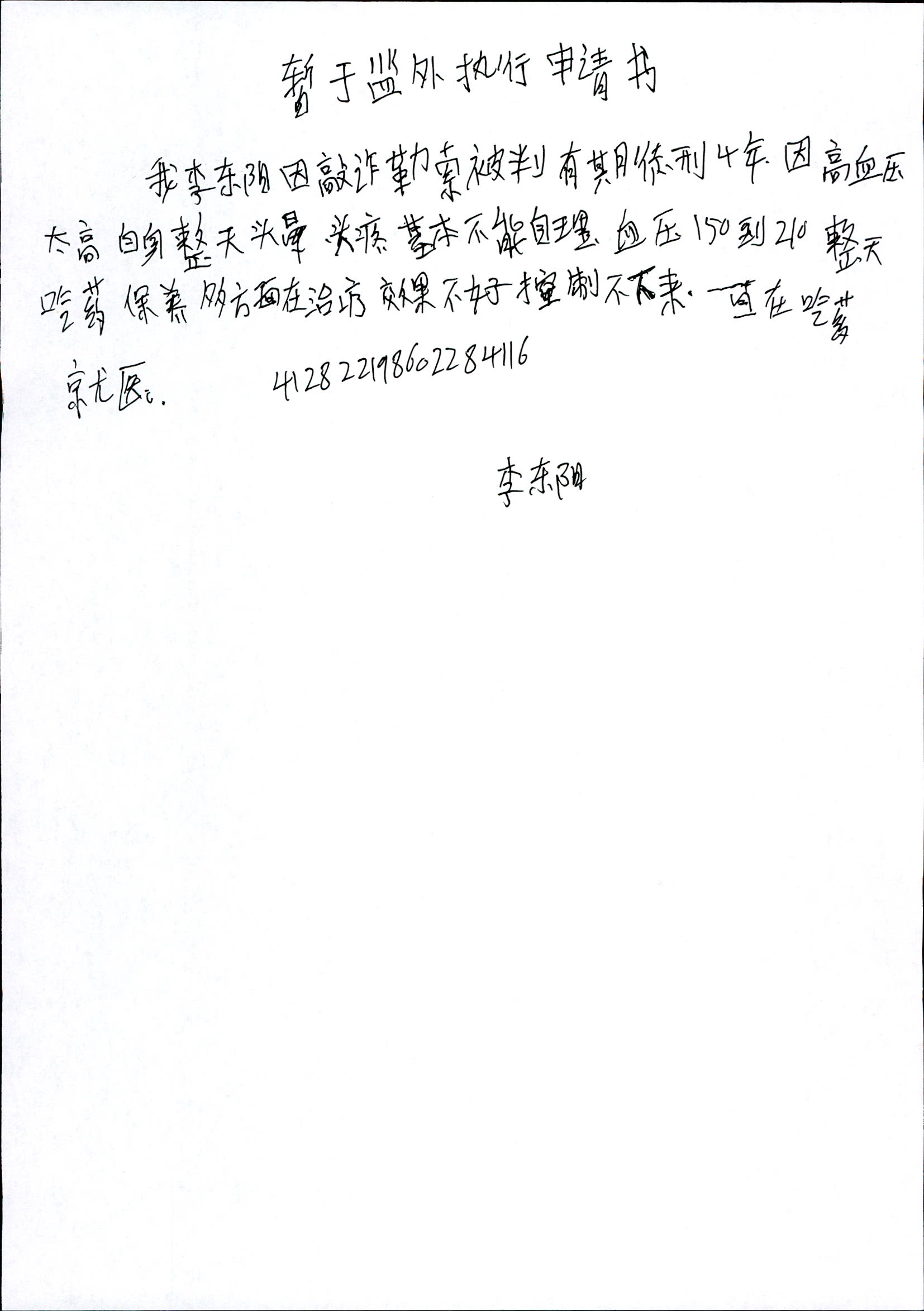罪犯李東陽,男,1986年2月28日生,漢族,初中文化,住河南省泌陽縣。罪犯李東陽因犯敲詐勒索罪,于2025年8月28日被我院判處有期徒刑四年,并處罰金人民幣四萬元。案件生效后,罪犯李東陽以其患有高血壓為由向本院申請暫予監外執行,本院已立案受理,現將基本情況予以公示,病歷診斷資料詳見附件。如有意見反饋,請于公示之日起三日內向我院提出。