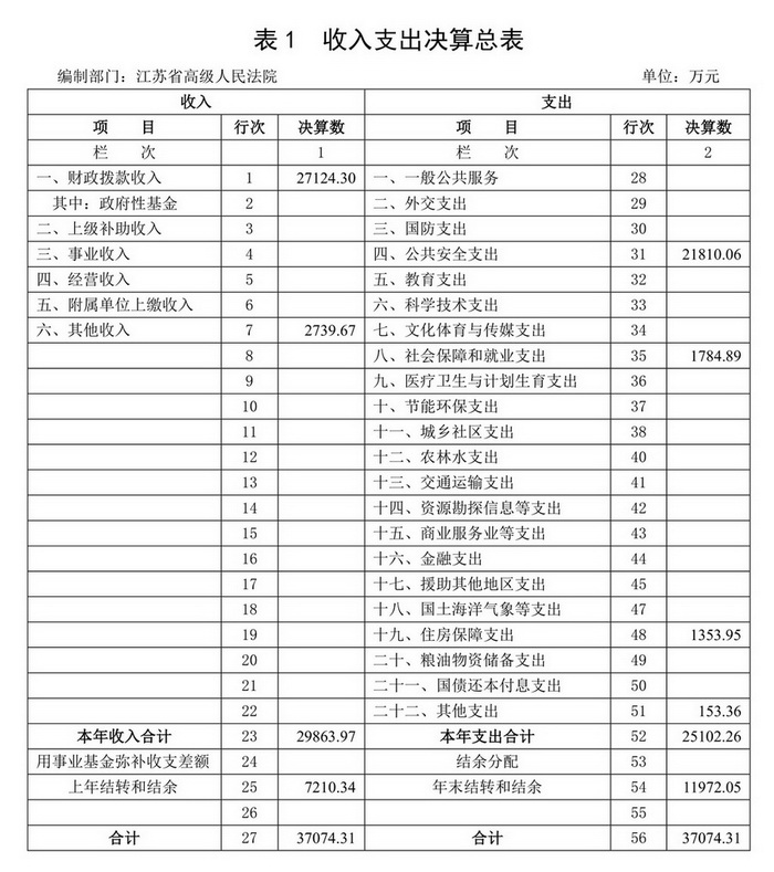 江蘇省高級人民法院2014年度部門決算包括:江蘇省高級人民法院(本級)、南京鐵路運輸法院、徐州鐵路運輸法院。省法院(本級)內設機構26個,其中審判業務部門15個、綜合部門9個、機關服務中心1個(法苑賓館)、教育培訓機構(江蘇法官培訓學院)1個。人員編制:行政716人、全額事業22人、自收自支30人。到2014年12月底實有人員712人,其中:行政人員699人、全額事業人員13人、離休人員28人、退休人員179人,其他人員35人。