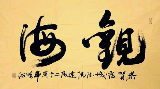 在宿城法院期間,連續兩個晚上,有幸應邀同來自人民司法天平雜志社的編輯、書畫家李君先生和來自河南法院的苗宇勤先生現場揮毫。兩位先生的書法和繪畫專業味十足,令我十分敬佩。尤其李君先生四尺宣的大幅國畫《西楚霸王》,人物形象栩栩如生,可謂形神兼備,霸氣十足,有一種令人感到震撼的效果;苗先生的山水小品也同樣功力深厚,頗得干警的喜愛。盡管我的字實屬一般,但我還是飽蘸濃墨,當場用4尺宣紙滿篇幅寫下了“觀海”兩個大字,因為仁者樂山,智者樂水,海的容量、海的能量、海的氣勢,又有誰能比?亦如這里的洪澤湖、駱馬湖煙波浩渺,正是基于此,我才寫了這樣一幅書法作品,贈予宿城法院。誠祝宿城法院以大海的胸懷、膽識和氣魄,穩立司法改革的潮頭,在英雄的故里,譜寫無愧天地、無愧時代,鐵肩擔道義,丹心鑄法魂的新篇章!