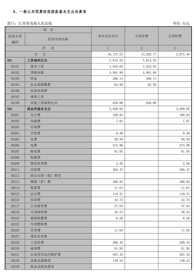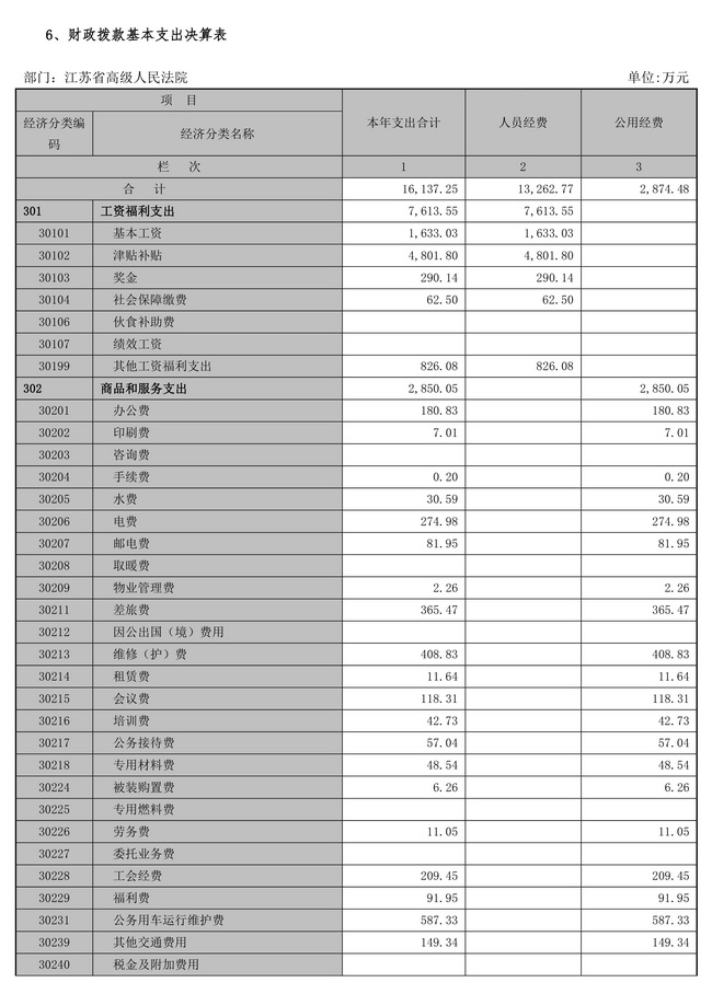 江蘇省高級人民法院2015年度財(cái)政撥款基本支出16137.25萬元,其中:
