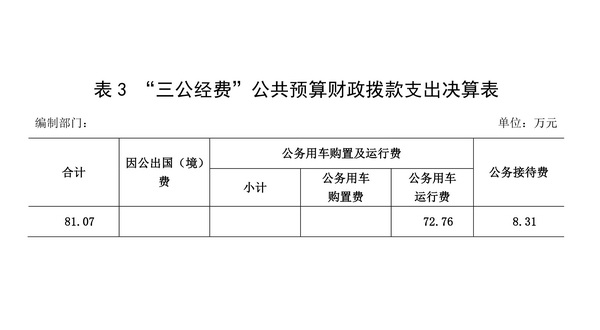 2013年,徐州鐵路運輸法院“三公經費”公共預算財政撥款支出決算 81.07 萬元,其中:因公出國(境)費支出 萬元,占 %;公務用車購置及運行費支出 72.76 萬元,占 89 %;公務接待費支出 8.31 萬元,占11 %。