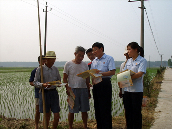 洪澤法院法官在田間為農民發送司法宣傳手冊,講解相關條文。(黃叢梅)