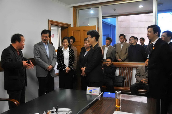 圖為鎮江市副市長曹當凌、鎮江中院院長帥巧芳等領導與人民調解員譚星海(左一)親切交談。
