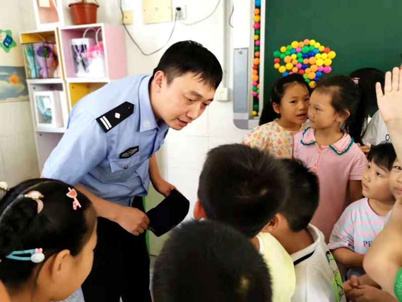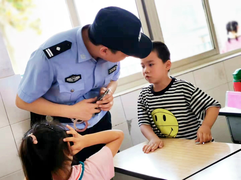 指著孫慶峰的臂章,一個孩子奇怪地問:“叔叔,法警又是干什么的?”孫慶峰在回答中巧妙地融入一些涉未成年人犯罪案例,講述了案件審理時,司法警察要做好安檢、押解、值庭等工作。既回答了小朋友的提問,又滲透了法治教育。