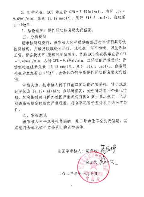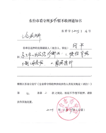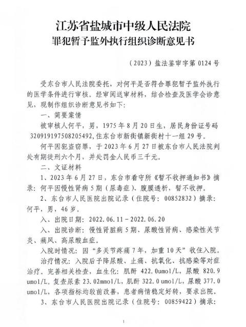 罪犯何平,男,1975年8月20日生,漢族,小學文化,無業,住東臺市新街鎮。罪犯何平因犯盜竊罪,于2023年6月27日被我院判處有期徒刑六個月,并處罰金人民幣三千元。案件生效后,執行過程中東臺看守所發現罪犯何平患有尿毒癥暫未收押,本院依規移送鹽城市中院鑒定,鑒定意見為符合暫予監外執行條件。本院依規決定對罪犯何平暫予監外執行,現將基本情況予以公示,病歷資料詳見附件。如有意見反饋,請于公示之日起三日內向本院提出。